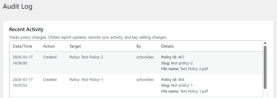 An Audit Log which shows you all actions taken withing the plugin, by who, and when. With PolicyPal Portal this will also show remote actions taken from the management portal.