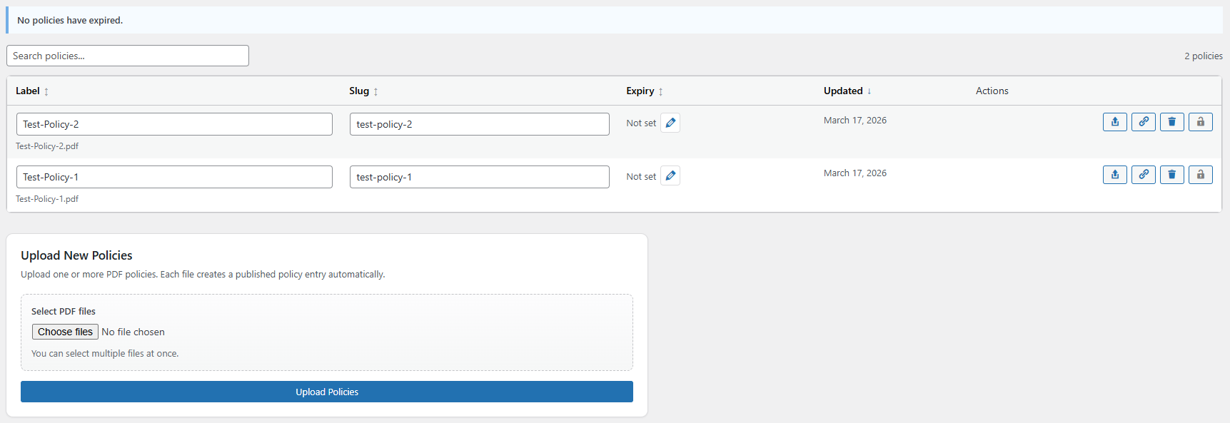 Manage Policies from a central location in the plugin settings. This panel contains the following features: