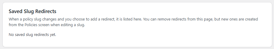 When a policy slug changes and you choose to add a redirect, it is listed here. You can remove redirects from this page, but new ones are created from the Policies screen when editing a slug.