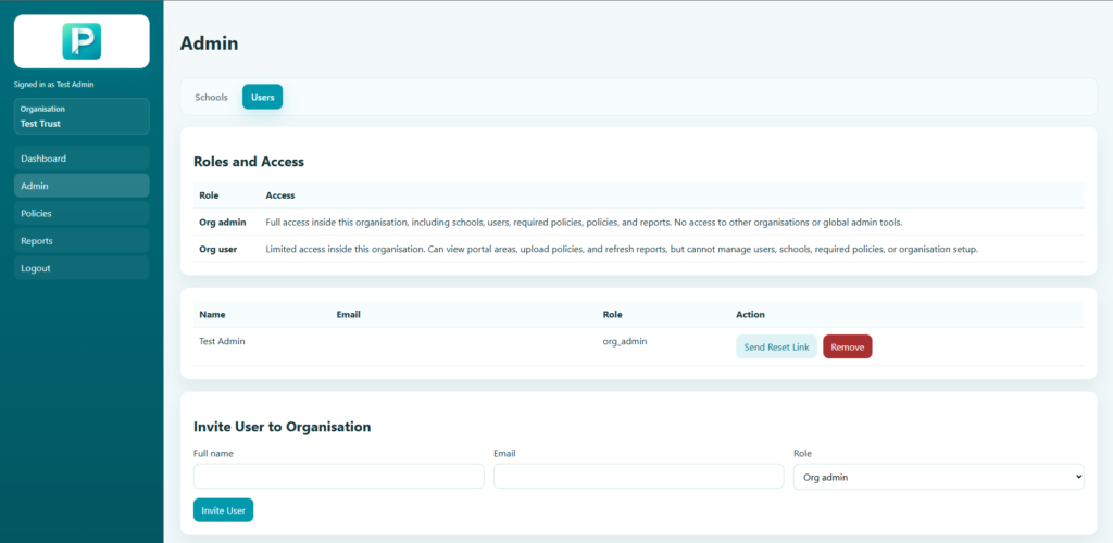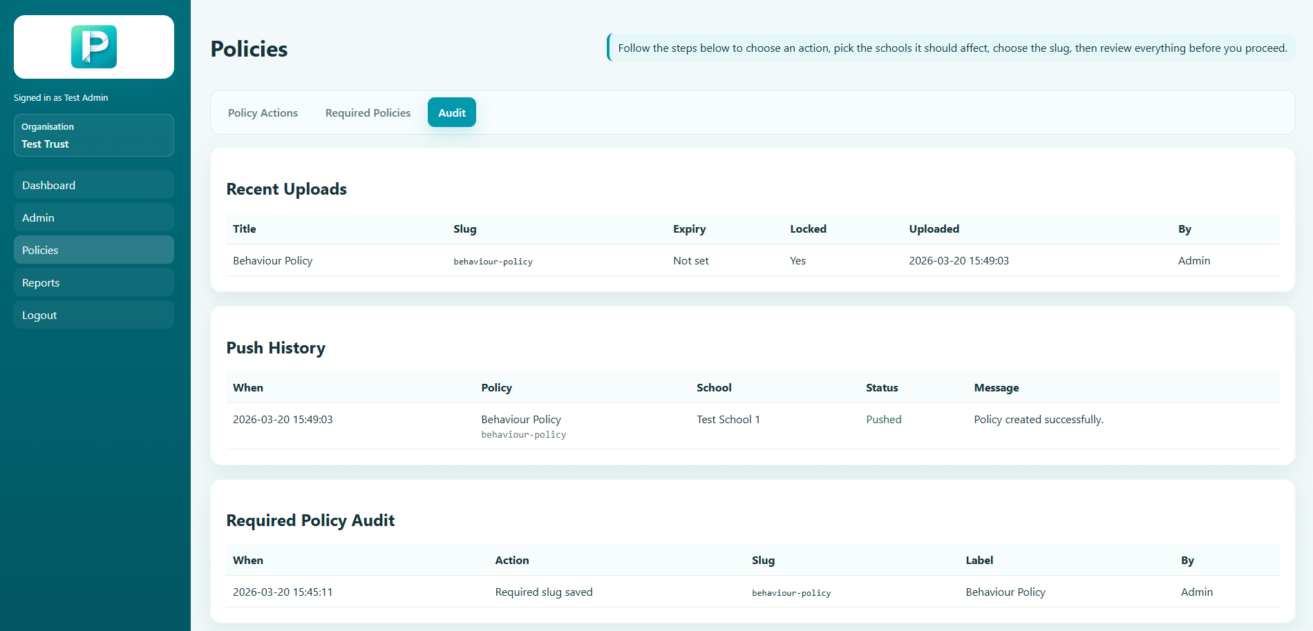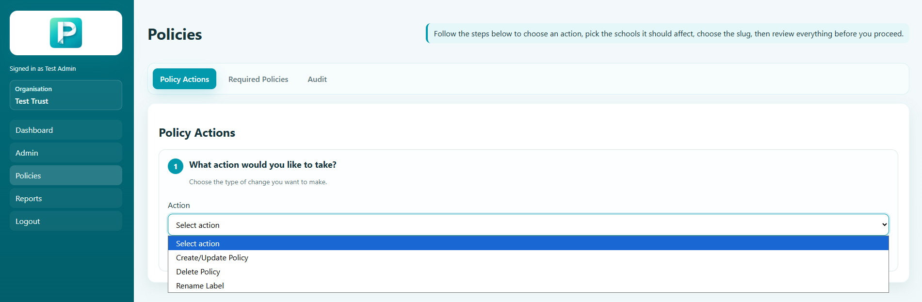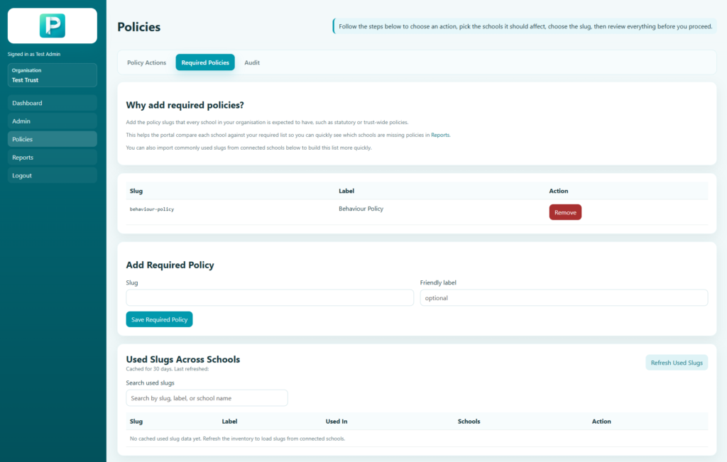 Set Required Policies for the Trust, that all schools must have. This will allow you to use the reporting features to monitor if any of your schools are missing policies.